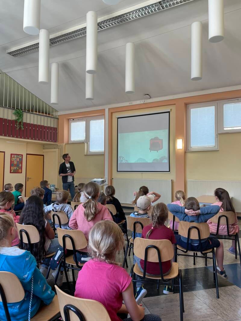 Im Juni 2024 freuten wir uns, Sven Gerhardt (Autor) und Marie Braner (Autorin und Illustratorin) bei uns an der Schule begrüßen zu dürfen. Sven Gerhardt stellte zunächst den 1. und 2 Klässlern sein Buch "Minna Melone" vor, danach den 3. und 4. Klässlern sein Buch "Herr Blomster". Marie Braner gab den Kindern einen kleinen Einblick in ihre Arbeit als Illustratorin.